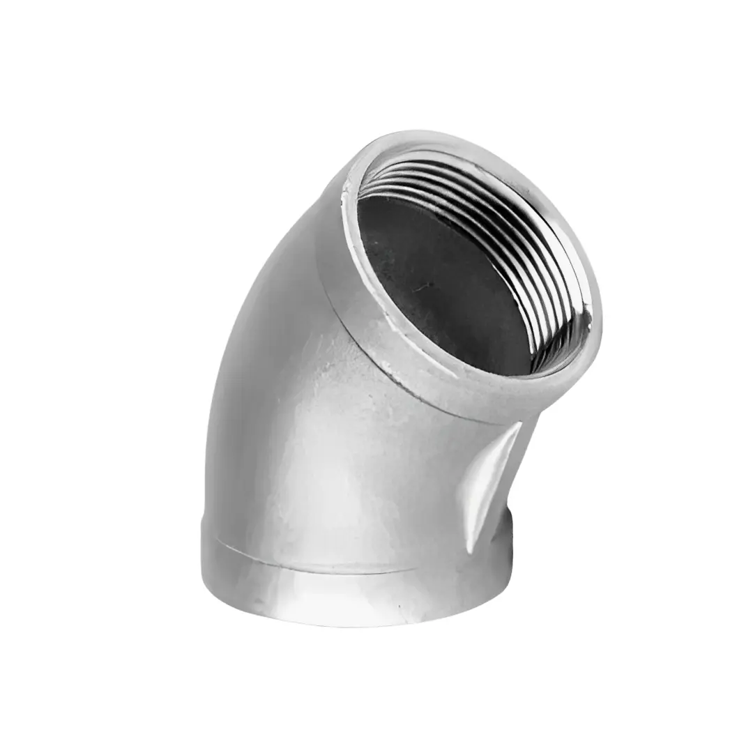 Características Classe 150 lbs em Aço Inox 304, com rosca BSP ou NPT. Indicado para mudança de direção em 45° em linhas roscadas, garantindo vedação eficiente e resistência à corrosão em aplicações industriais.
