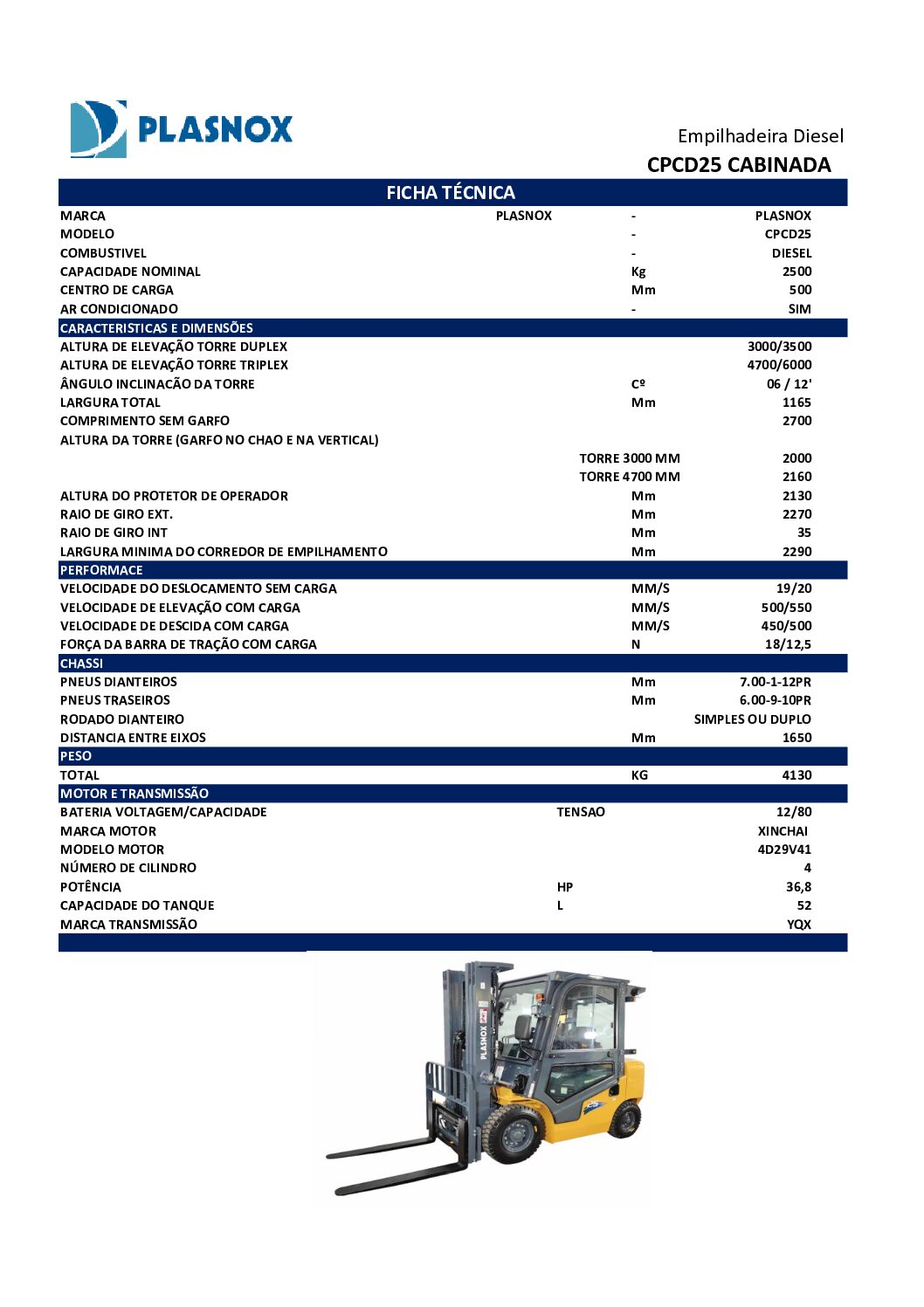 Equipada com cabine fechada com ar-condicionado, motor Xinchai 4D29V41 de 36,8 HP e transmissão YQX, a CPCD25 Cabinada garante robustez, estabilidade e maior conforto ao operador, sendo ideal para aplicações intensivas em centros de distribuição, indústrias e pátios logísticos.