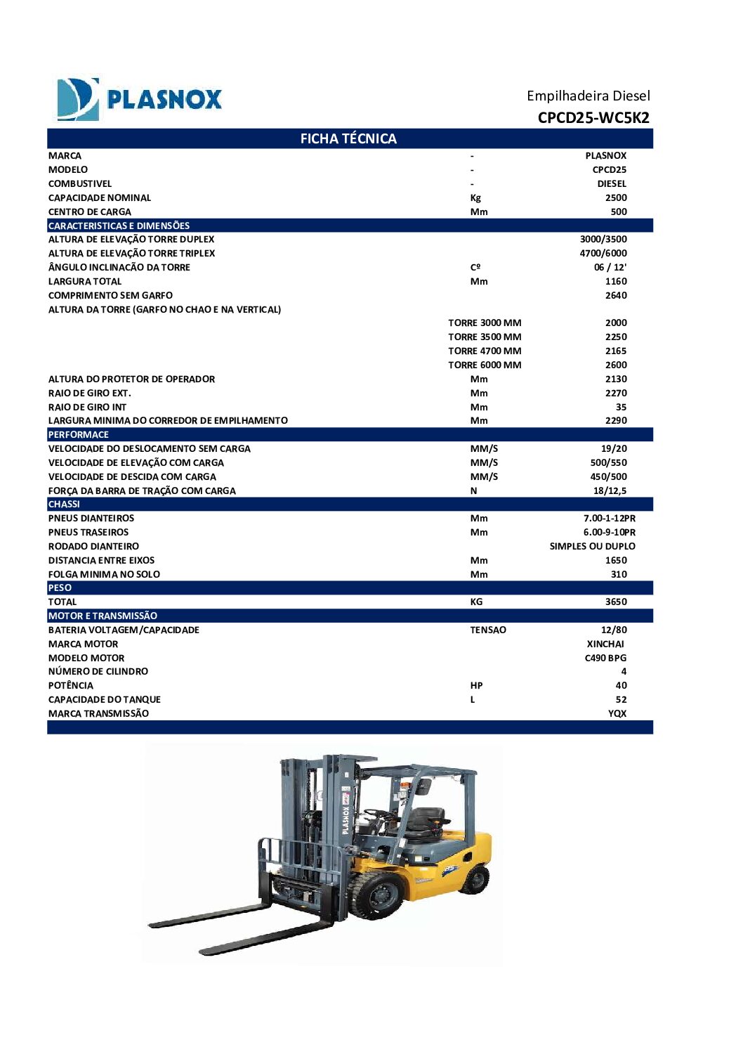 Equipada com motor Xinchai C490 BPG de 40 HP, transmissão YQX e estrutura reforçada, a CPCD25 oferece excelente desempenho, estabilidade e durabilidade, sendo indicada para aplicações intensivas em centros de distribuição, indústrias e pátios logísticos.