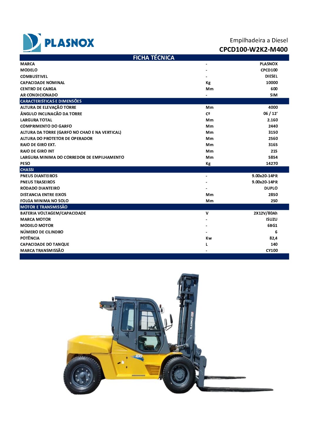 A Empilhadeira Diesel CPCD100 – Plasnox foi desenvolvida para aplicações extremas que exigem máxima capacidade de carga, robustez estrutural e alto nível de conforto operacional, sendo ideal para indústrias pesadas, portos, centros logísticos e operações de grande porte.