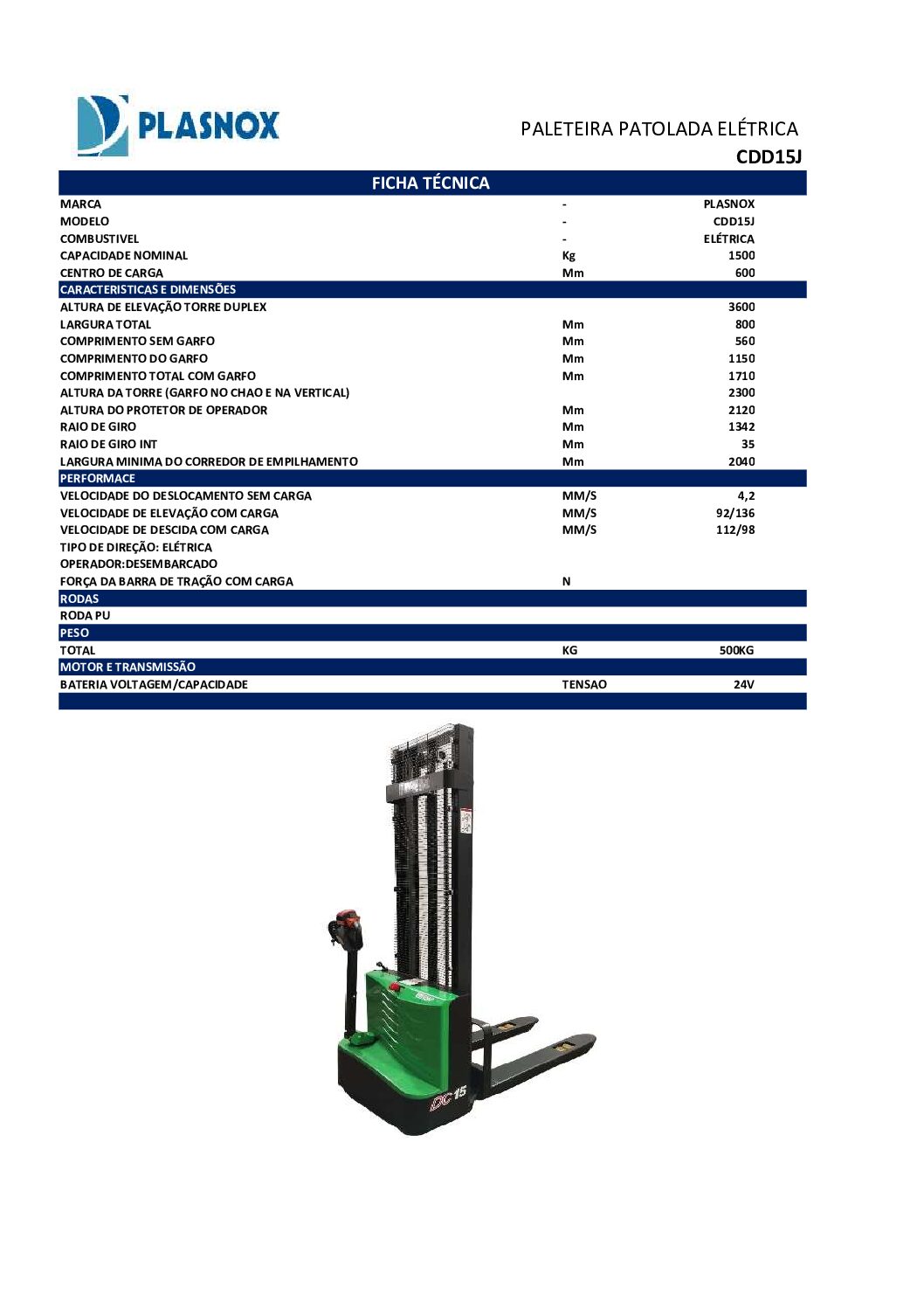 A Empilhadeira Patolada Elétrica CDD15J – Plasnox foi desenvolvida para operações que exigem precisão, segurança e eficiência em ambientes internos, como centros de distribuição, estoques e áreas logísticas.